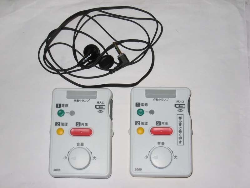 写真のように 2006年型と2009年型では外見はほとんど同じだが互換性はない。2008 年のメモリカードを 2009年の機器に挿しても使うことができる(その反対も可)。ところが 2006年のメモリカードを 2008, 2009 年の機器に挿しても再生できない(その反対も不可)。試験終了後は機器とヘッドホンは持ち帰っても、置いたままで帰ってもどちらでもよい。実際にどうするのか観察していると、