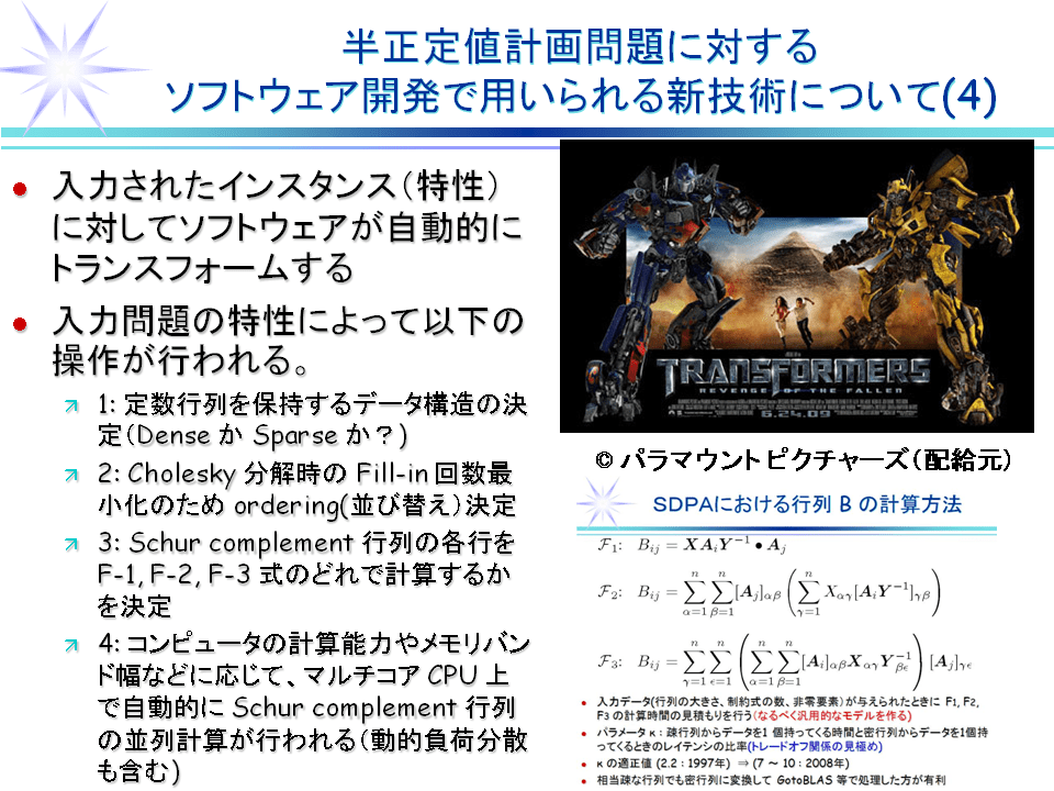 SDPA の特に SCM (Schur Complement 行列) のマルチスレッド計算の部分を改造中。動的負荷分散は成功していたのだが、それ以前に動的にすることによって計算時間が増えるという現象があるようだ。CRAY XMT のようにデータキャッシュの無い CPU であれば、計算順番はあまり気にしなくても良いのだが、Nehalem-EP のように 8MB も L3 キャッシュがあると計算順番で大きく実行時間が変動する(以前提案した類似性検索なども関わってくるだろう)。静的(予め計算領域と CPU コアを対応付けておく)にすると計算時間は安定するのだが、今度はコア間の計算時間の平衡を予め設定して達成しておく必要がある。いろいろなアイデアがあるので、プログラム自体にも大きく変更を加えている。