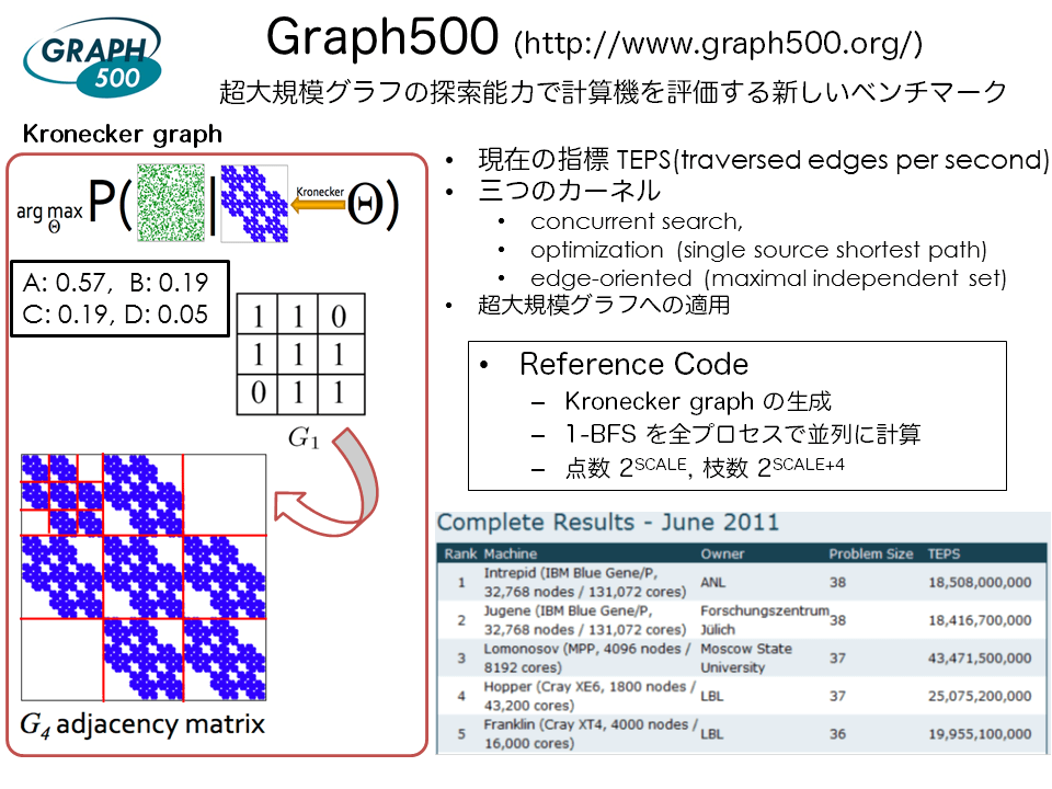 2011-10-06 Graph 500 に対するアプローチ その3 Weblog JST CREST 研究課題名 : ポストペタスケールシステムにおける超大規模グラフ最適化基盤 Graph 500 に関してですが、非常に大規模な環境でのソフトウェアの実行と TEPS 値の測定が終了しました。結果等は SC11 での発表となります。