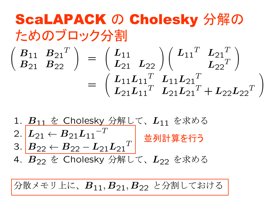 2011-12-02 Cholesky 分解とCPUとGPU:その1 Weblog SDPARA では ScaLAPACK を用いて Cholesky 分解を行っている。これを効率良く並列処理するために以下のようなアルゴリズムを採用している。LU 分解とCholesky 分解は似ているようで異なるが、それでは全く異なるかというとそうでもなく LU 分解のプログラムを再利用して Cholesky 分解を作ることも可能である。この場合でも行列積の速さが全体に大きな影響を持っている。