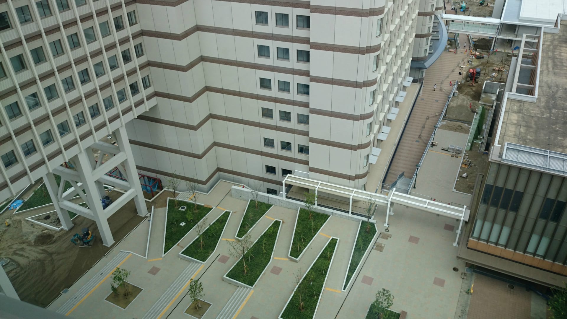 2015-08-19 九州大学伊都キャンパスウエスト1号館 Weblog 九州大学伊都キャンパスウエスト1号館 ウエスト1号館本体の工事は完了しており、周辺の通路や教室、福利厚生棟(カフェテリア、コンビニ、ファーストフード)の工事が進んでいます。
