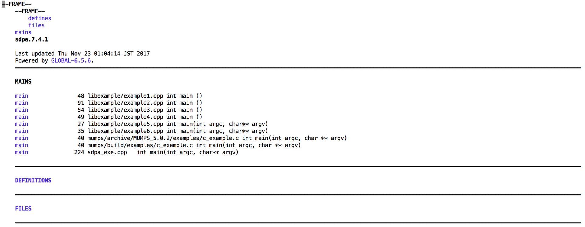2017-11-27 global Weblog global 標準では入っていないコマンドですが、globalと言うsource codeを見たりする時に、結構便利なツール類が存在します。これらはtag fileを作成し、これらをemacs等から読込むことによってタグジャンプを行ったり、変数や関数が相互参照可能なhtmlを作成してくれます。 SDPA 7.4.1 ではこんな感じです。。。